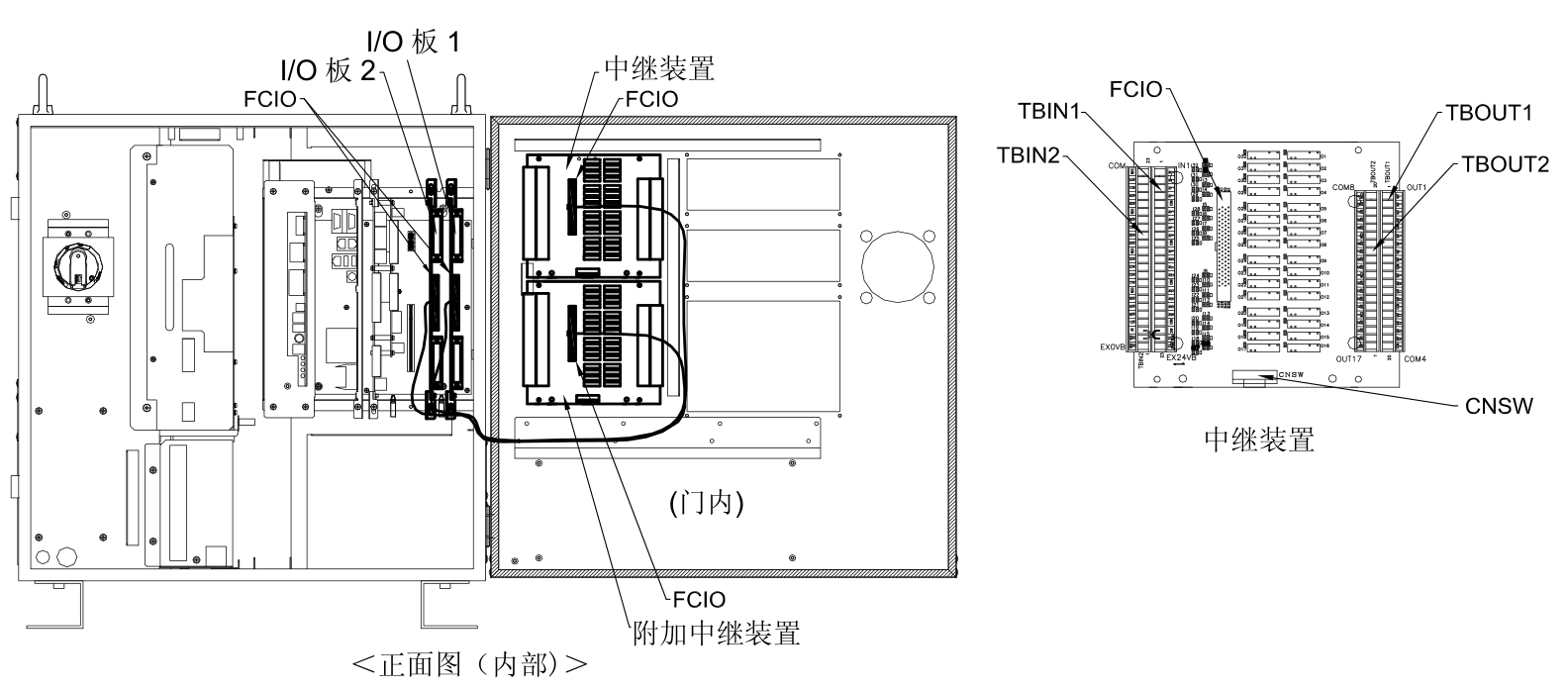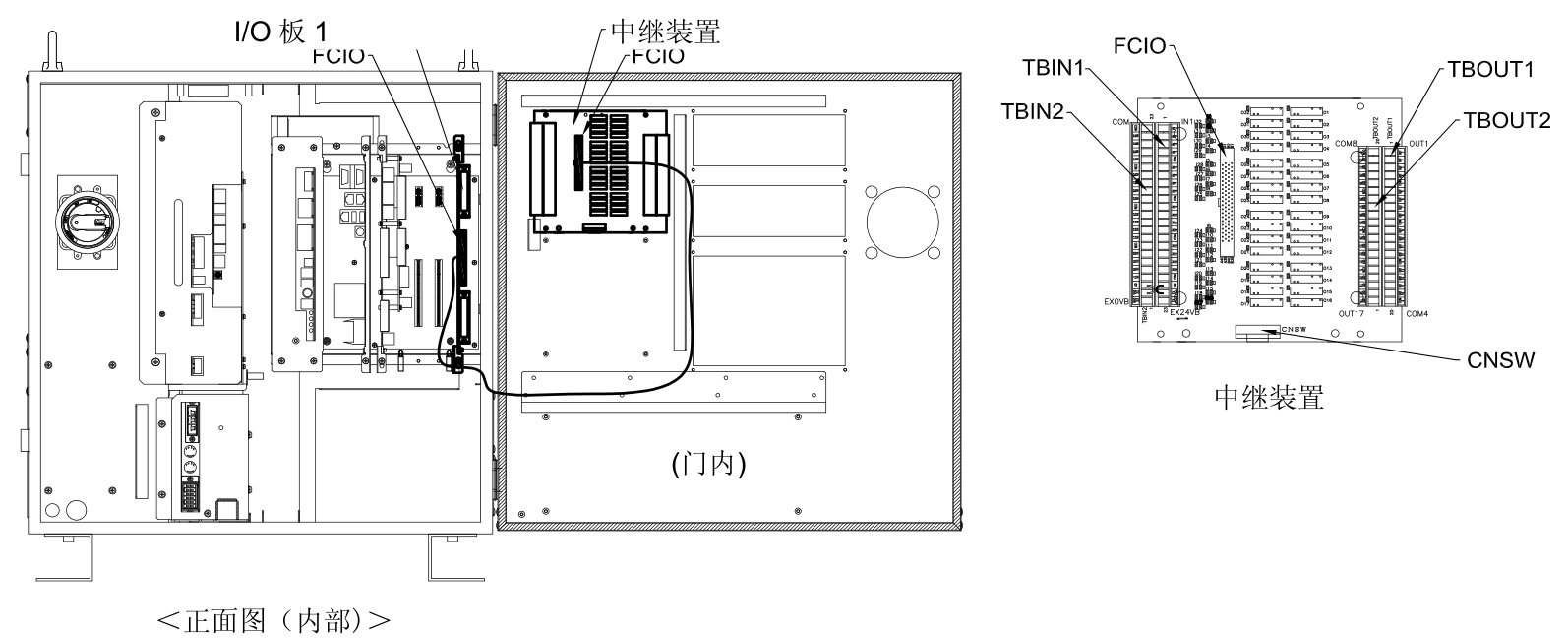 下圖是OTC焊接機(jī)器人中繼裝置,附加中繼裝置,端子臺和 I/O 板的位置(使用了 2 個中繼裝置)